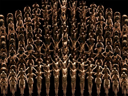 The beginning of modernism, whose roots go back to the age of enlightenment and the beginning of industrialisation in the 18th century and which reached its first heydays in Western metropolises in the 19th century, was accompanied by the development of two seemingly paradox and contrasting phenomena, individualism and mass society. The trend towards uniformity of economic systems, mass transportation and mass media, which we nowadays associate with the term globalisation, also leads to a certain uniformity in peoples’ life designs. That is why many people want to stand out from this homogenous crowd. The various forms of subjectivism and standing out from the masses that were tried out in the first avant-garde movements since romanticism by artists, actors, and poets became a model for an individualistic concept, whose mirror image was reflected by fashion and its two extreme representatives, diva and dandy. Once daily needs are covered, and often times even before that, people begin to display their own individuality, from clothing and hairstyle to piercing and tattoos; all this is intended to ascertain their uniqueness within a mass society. And where this striving for individuality goes hand in hand with lifestyles that seem to contradict traditional ideas and values, it is once again the object of intense criticism from orthodox religious circles of different origins and is regarded as a pathological symptom of a decadent Western liberal lifestyle. It is from this sociological development that Claudia Rogge derives her central theme, the relationship between the crowd and the individual. Her central thesis, however, reduces the dichotomy between crowd and the individual to absurdity. For her, individualists are also representatives of a role model, whose different ways of expression, in the last analysis, can be traced back to social conventions. She does appreciate this striving for individualism, which is closely linked to the pursuit of personal freedom, because it extends the individual’s range of options to act, but in the last analysis it remains a first or second order derivative of accepted social standards, to which it remains structurally linked – even in its provocative negation. Claudia Rogge has sounded out her subject matter in different ways and with different strategies. Following her work in the public space with her two projects “mob il 1” and “mob il 2”, the first one being multiple reproductions of babies’ heads and the latter one multiple reproductions of crouching men, which she exhibited on her glass-sided truck in many European cities to trigger off an open discussion, she moved on to photography and thus entered the space dedicated to art in the narrower sense of the word. Each of the pictures of her “Rapport” series, which was first exhibited at Voss Gallery in 2005, shows individual human beings, mostly in a static pose, whose photographs were mounted into regular groups with the help of a computer. Intersected by the image borders, these groups seem to extend far beyond the visible space, and they produce a striking perceptional-psychological effect, which consists in the attempt of our perception to comprehend each individual figure as a single real-life person in spite of the apparent identity of the models that are multiplied in the picture. Even before the onset of any rational thought, this contradiction generates a tremendous suspense, which can only be broken, if the concrete form of human bodies gives way to their perception as a pattern repeat. Accompanied both by the fascination and horror of uniform, well-disciplined crowds of people, an ambivalent field opens up, full of associations, ranging from the military to prisoners’ camps, sports and variety shows. After a series of other works, in which Claudia Rogge further explored the topic of pattern formation, by arranging figures and parts of the body into ornamental configurations, which, as installations, could then be used to decorate walls and floors of rooms, in her current pictures she now differentiates the crowd in a new way. The pictures at the U N I F O R M exhibition no longer depict single models in largely static constellations. Her new pictures are characterised by an encounter of different protagonists in spaces full of action and determined by movements. For this purpose, she took pictures of her models in several postures and in different sequences of movements, a process, which increased Claudia Rogge’s workload tremendously, since she now had to look at about 10,000 pictures, select them, and process them on a computer for photo-mounting. Her photographic work was preceded by an analysis of masses with a view to identifying basic role patterns, which the protagonists of her pictures embody as role models. These protagonists form the iconographical background for a deeper understanding of her pictures, in analogy with the personifications of an allegorical concept, which was used in the Occident to illustrate types of being, types of action, and ethical concepts. Claudia Rogge’s prototypes carry poetically sounding names that convey their meaning. Names like the female catcher of souls, the criminal, the icon, the relevant man, the woman that is being evaluated, the unworthy, the conservative woman, the spiritual man, the follower, the intruder, and the one who passes judgment. This does not mean that these prototypes are tied to a specific gender, nor does Claudia Rogge claim that they all exist in their pure form. In real life, these prototypical aspects always exist in a mix, and yet often individual aspects dominate and determine the perception of others and one’s self-perception and define the position and the action of the individual within a crowd. Like in her “rapport” series of pictures, spatiality is created by the arrangement of the figures inside the space of the picture and through the perspective she chose for the shot. But from pic