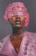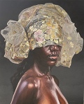 a certain predilection for details. Working from his own photographs, he does not simply content himself with making paintings look like photographs. Rather, he emphasizes their photographic effect, this strange “as if”. Indeed, although their similarity to photographs is so striking, it remains evident, that here, the painter is masterfully and subtly reproducing in paint photos in such a way that the pictures produced in the process can at the end indeed be viewed as comprehensive paintings. Here, a painter virtually simulates a photographer in a perfect way, yet at the same time deviates from the template. On the one hand, this has to do with his assertion of verisimilitude. On the other hand, it has to do with the fact that he is concerned with representing a moment and not a lengthier period of time. As a painter who dives into the wealth of nuances of photography, in order to come just as close to them as possible, he consequently insists upon the perspective of his medium. This means he wants to emphasize that his pictures refer to a reality and do not create any fictions. Subtly oscillating between the two mediums, he so awakens the paradoxical appearance that what is painted is photographed and real. At the same time, he says everything is painted, implying he required more time for the depiction than the photographer did to take the picture. He lets us linger in this intermediate zone. Precisely due to this, the moment captured by him gains a meaning cut out from the indifferent flow of time. He highlights them through painting by employing accents that be similarly emphasized in photography. All this forces us visitors to involuntarily ask, why is this moment captured? What is it referring to and what does it contain? What significance is ascribed to what is displayed? As a start, his genre is portraits of people from his Nigerian homeland, men as well as women, all of them young in age. The way in which he paints portraits of people is reminiscent of the style of portraiture of African photographers, especially Malian Seydou Keïta, who was born in 1923 in Bamako and died in Paris in 2001. Idowu invokes his work as a source of inspiration, and, sure enough, the parallels are noticeable. Keïta also had his models pose in front of the camera in his studio with their possessions or accessories like radios, clocks or motor scooters. With him, they too wear African outfits. Idowu adopted this idea. Yet in contrast to the people portrayed by Keïta, whose faces touch us emotionally and allow us to sense their psychological conditions and living situations, Idowu primarily shows bodies in their entire beauty but without any physiognomy. By concealing either part or all of the heads of his models with patterned cloths, so that only their noses and mouths peak out, he lends them a protective anonymity from any questioning. To the extent that he blends out everything we ordinarily associate with portraits, we can speak here in a certain way of an anti-portrait. Neither names are named nor are characteristics enumerated. In this way, it is impossible to gaze behind the outer appearance. Thus, we are prevented from forming a concrete image of the models. The facelessness is the idea, to the extent that reading traces of a life into the faces is not just pushed into the background, but rather limits are intentionally set on doing so. According to Idowu, “the faces are consciously covered in order to protect the bearers of my message. And in order to show how faceless the minority is”. This information about his intentions lends another perspective to his portrayals of Yoruba, who pose like for a photo shoot, but not with the intention of highlighting their individuality. He has something else in mind. In fact, with the help of the portraits, he directs our attention to the global public’s ignorance about his country, which is the most populous on the African continent. He himself sees in the potential of the mass of the impoverished, suppressed by the political leaders of his homeland, a possible beacon of hope for humanity. His concern is the way Nigerians are perceived at home as well as among the diaspora in other nations, together with the hardship and uncertain living conditions of his compatriots - impoverished en masse and threatened with murder - who suffer greatly under the political circumstances. Yet he has created no pictures out of the desperate daily life of Nigerians.